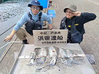 飯田氏、田宮氏(浅場の筏)凪で皆様釣られてよかったです。小鯖も入ってきました。海の中は賑やかに。チヌ狙いボラガンガン!カワハギも多いそうです。明日は爆風で休船します。水温18.1 |
